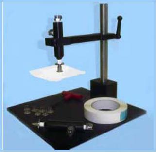 可调节高度的支架有两种探头穿透包装方法,一种是探头朝下,如上图,另一种旋转夹具是的探头朝上,能适应更大尺寸的包装。符合ASTM 1140测试标准,包装必须在接近中心点穿透。旁边的图形显示Package-Port使用胶粘片密封包装表面。穿透探头外径和Package-Port内部密封,而探头的内径和包装内部空间连通。通过气源和探头和仪器形成泄漏紧密路径。测试使用软的可剥离包装材料三边密封包装袋:使用一套TME开口包装测试夹具,配合BT-1000自动包装测试仪。
